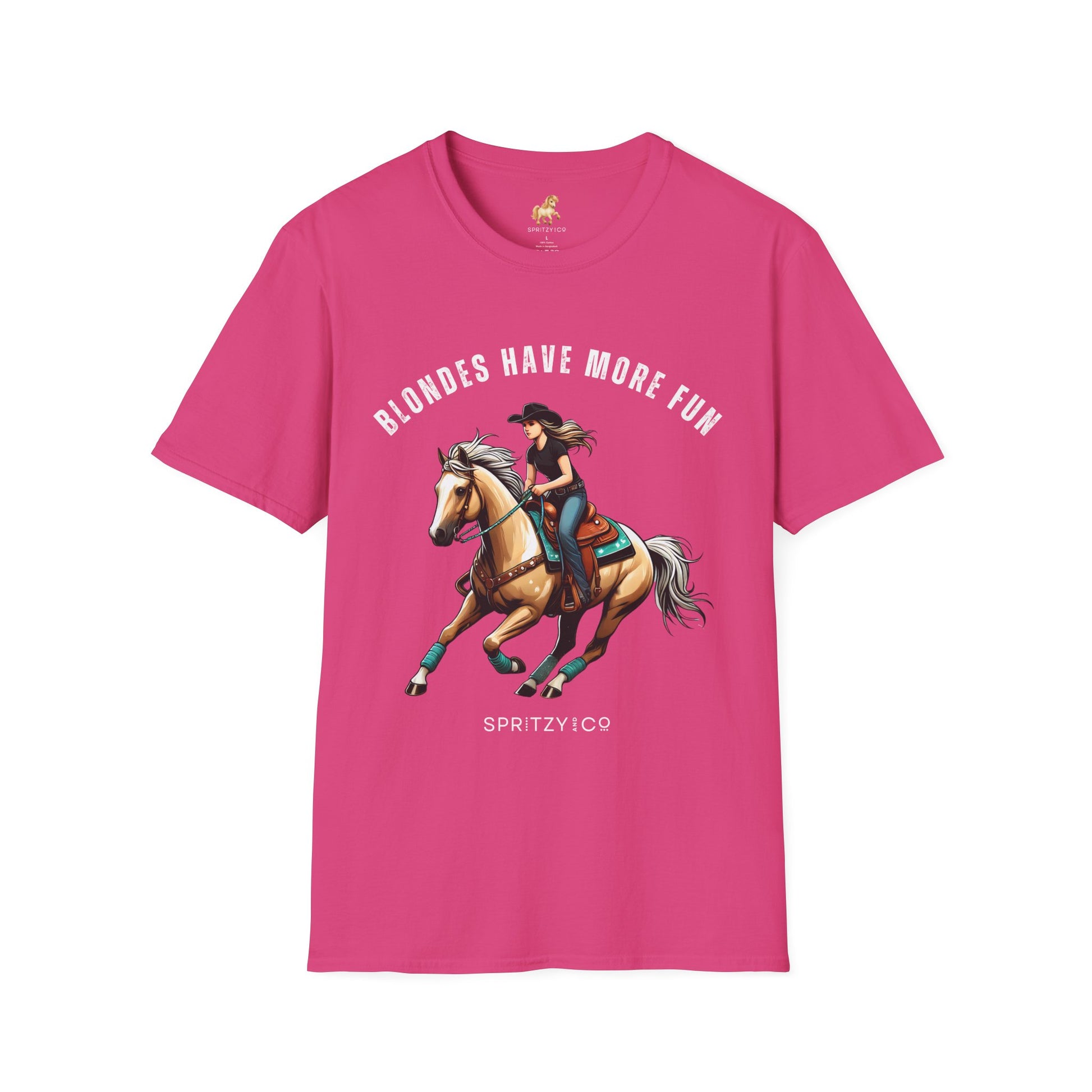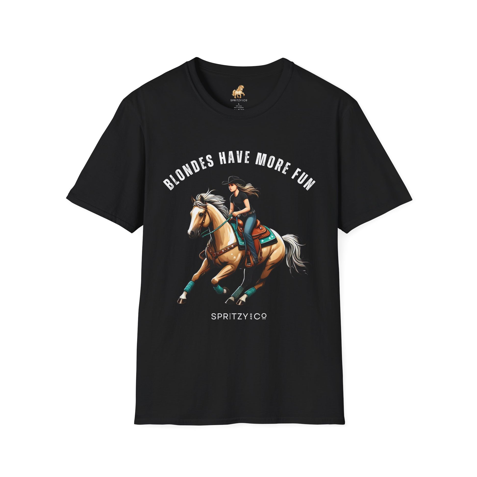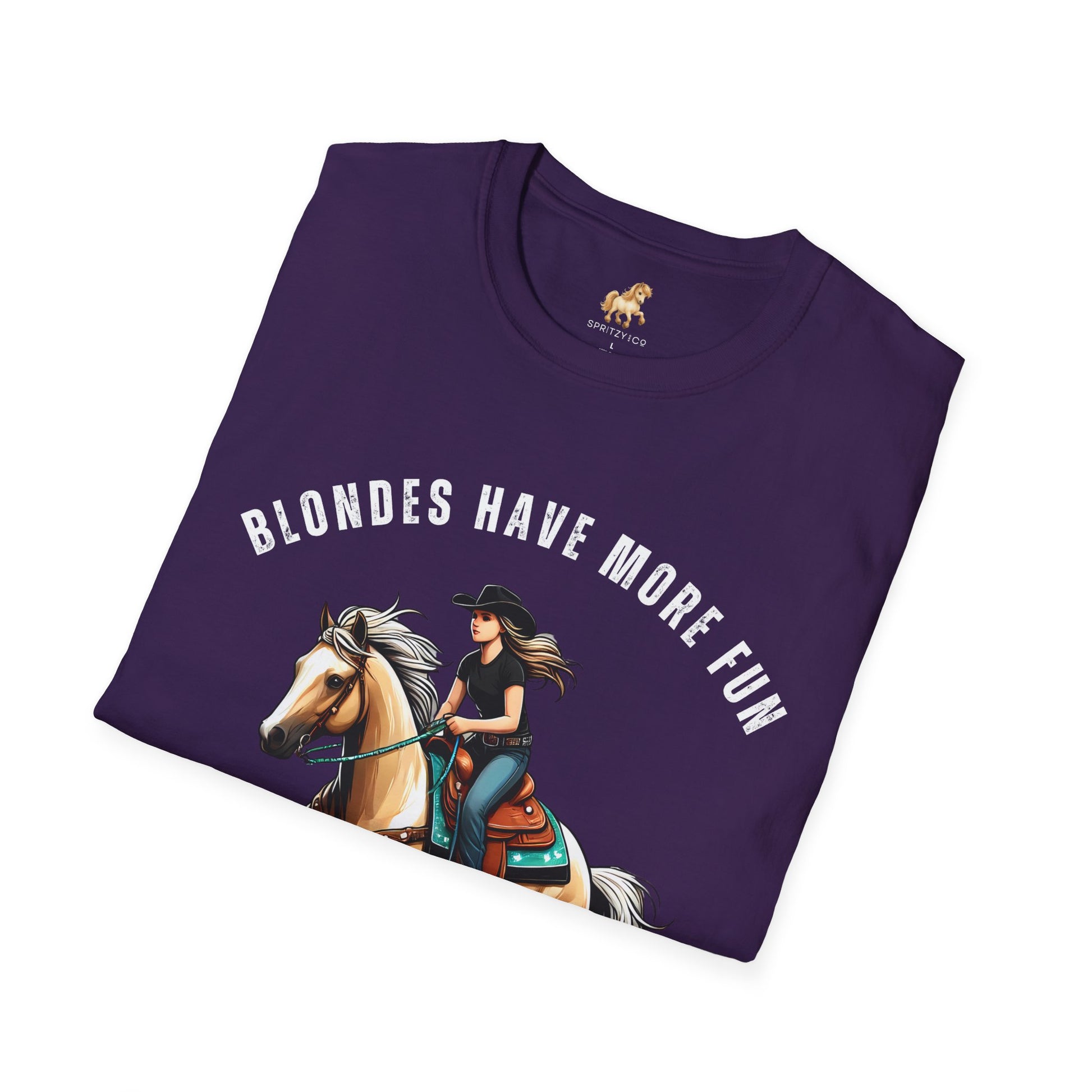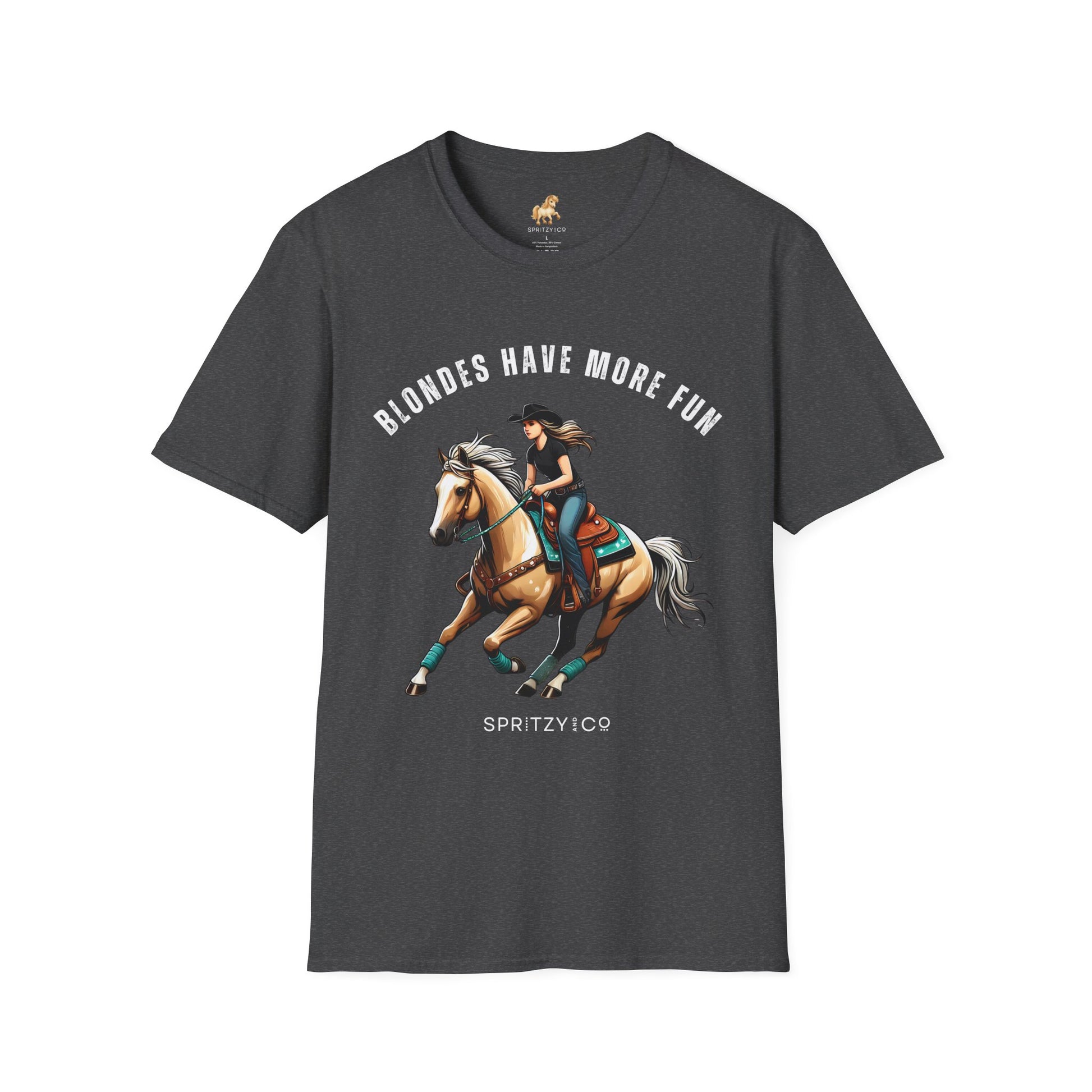 Saddle up for a little sass and a whole lot of fun. This super soft T-Shirt features the cheeky phrase "Blondes Have More Fun" paired with a bold, confident rider atop a golden palomino — because we all know a flashy mane turns heads in and out of the arena.